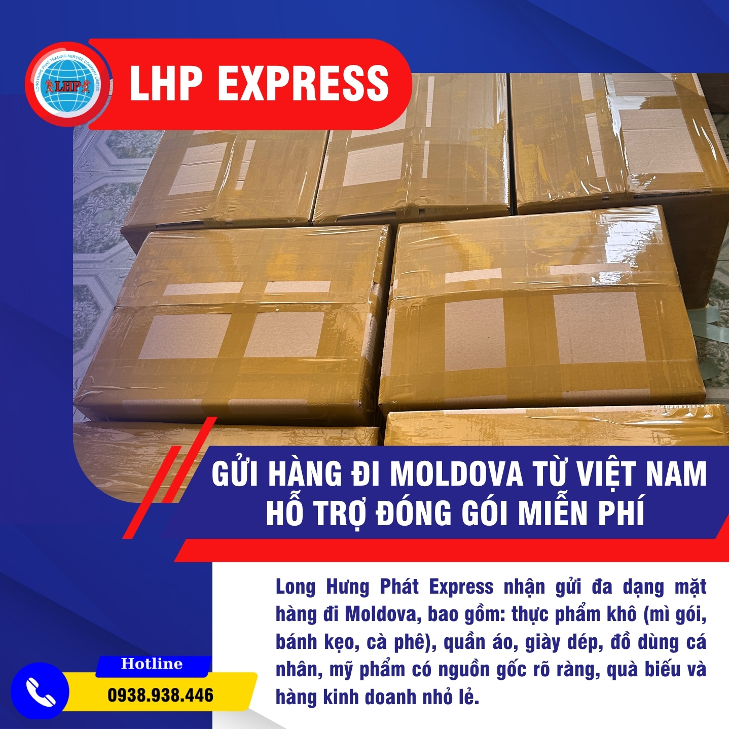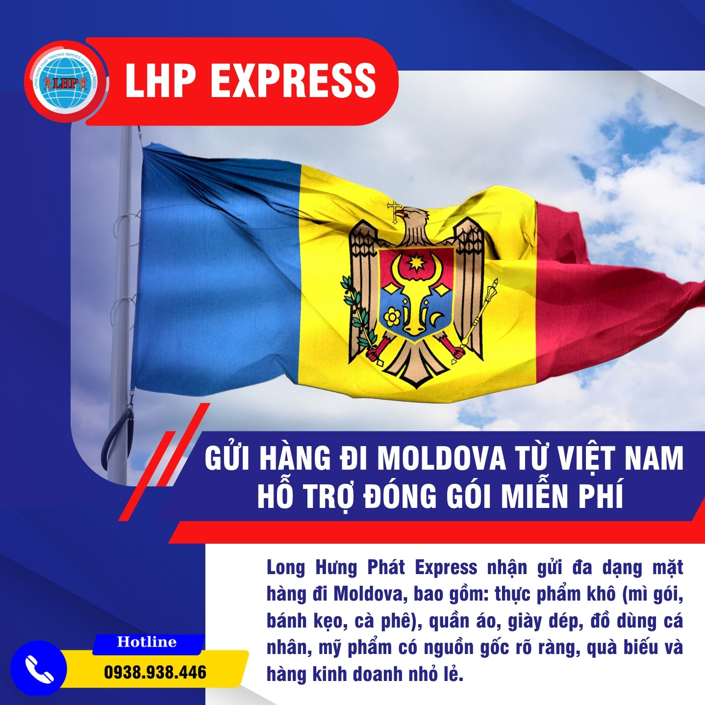 Giá gửi hàng đi Moldova phụ thuộc trọng lượng, kích thước, loại hàng và hình thức vận chuyển. LHP Express báo giá trọn gói, minh bạch, không phí ẩn; hỗ trợ đóng gói cơ bản miễn phí và nhiều ưu đãi cho khách gửi số lượng lớn. Nếu khách hàng đang có nhu cầu liên hệ ngay: Hotline: 0938938446 (Ms. Hạnh) để được hỗ trợ báo giá tiết nhất!