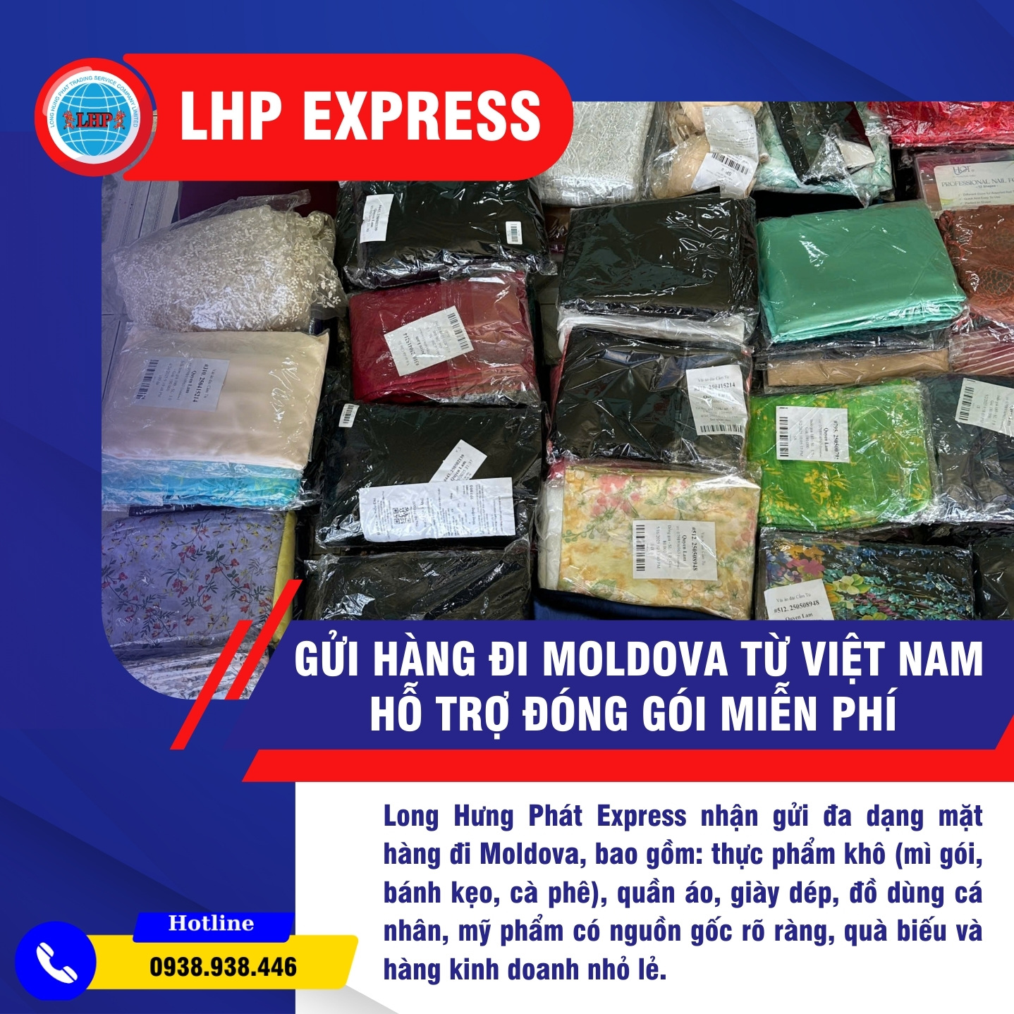 Long Hưng Phát Express nhận gửi đa dạng mặt hàng đi Moldova, bao gồm: thực phẩm khô (mì gói, bánh kẹo, cà phê); quần áo, giày dép, đồ dùng cá nhân, mỹ phẩm có nguồn gốc rõ ràng, quà biếu và hàng kinh doanh nhỏ lẻ.